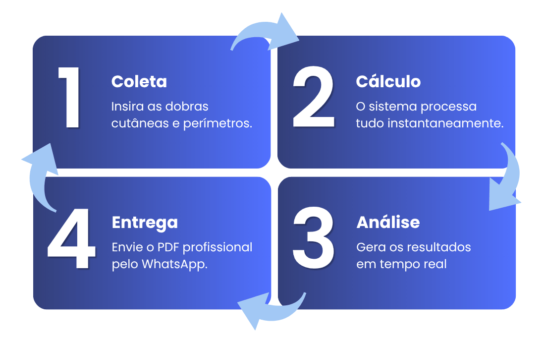 Realize avaliações físicas completas em poucos minutos, com cálculos automáticos e muito mais precisão no seu atendimento.